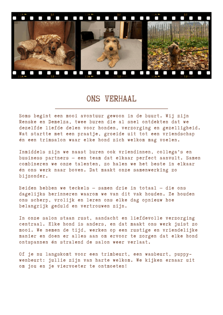 Over ons Wil je een afspraak inplannen voor je viervoeter? Leuk! Stuur ons een appje, dan kunnen we een plekje reserveren in onze agenda. +31616171392